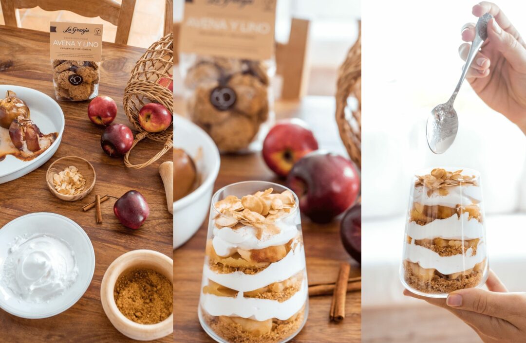 7. Ara toca muntar el Crumble! En un recipient individual, com un got, col·loca una primera capa de la barreja de galetes. A continuació, afegeix una capa de làmines de poma, una capa d’ametlles amb canyella i, finalment, el merengue. Repeteix el procés successivament.