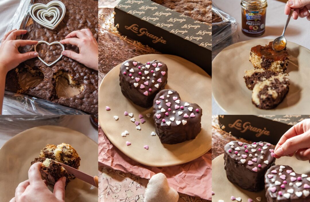 - Start by opening the 1.8 kg sheet of gluten-free and lactose-free marble cake from La Granja Foods. Using a heart-shaped mold, cut heart shapes out of the cake and place them on a plate. If you don’t have a heart-shaped mold, draw a heart on a blank sheet of paper, cut it out, and use it as a guide to cut the cake into a perfect shape.