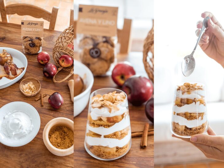 - Toca realizar el montaje del Crumble. En un recipiente individual como un vaso, dispone una primera capa con la mezcla de galletas. A continuación, añade una capa de láminas de manzana, una capa de almendras con canela y por último el merengue. Repite el proceso sucesivamente.
