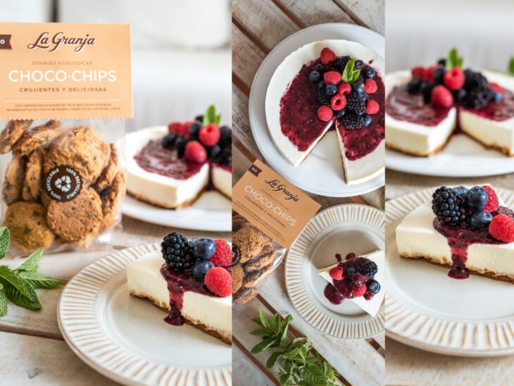 6. Tritura los frutos rojos con una cucharada de zumo de limón (puedes añadir un poco de edulcorante si prefieres que quede más dulce) y agrega la mezcla sobre la tarta.