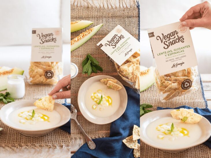 - Sirve la crema de melón con melon picado, un poco de AOVE, y pimienta negra recién molida. El toque especial y crunchy dáselo con los Vegan Snacks de Lentejas, Guisantes y Espinacas de La Granja.