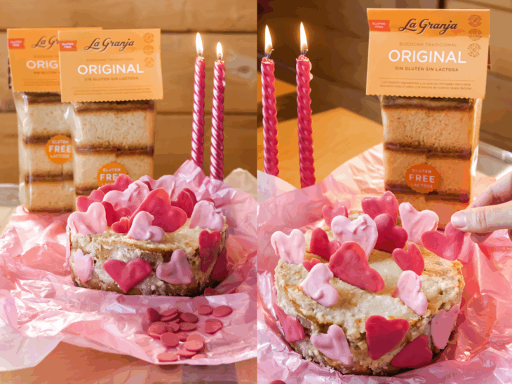 - Empezamos introduciendo los 2 paquetes del Bizcocho Tradicional Sin Gluten y Sin Lactosa de La Granja Foods en un bol, junto con 1/2 litro de leche o bebida vegetal. Amasamos con las manos hasta conseguir una masa e incorporamos esta masa en un molde desmontable para darle la forma de pastel. Os recomendamos con una cuchara ir moldeando la masa de bizcocho en el molde para que encaje bien y que se quede con la forma deseada.